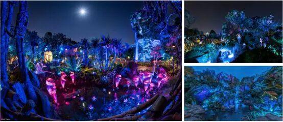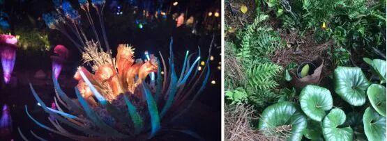 夜间更能体现潘多拉的特色,大量的发光植物包装,采用了很多LED与透光树脂造型的组合工艺。