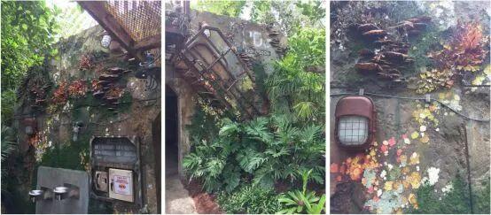 这的包装都是围绕着“真实的潘多拉“来创造的,所以当我们进入主题公园时就能体会到,公园包装不仅做的漂亮,更是融入了故事。一方面公园的植物茂盛充满细节,另一方面,从洗手间到餐厅随处可见的人类设施,其设计都来自之前影片中的采矿集团RDA,因为设定是ACE重新利用了RDA的废旧设施。