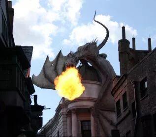 环球影城哈利波特对角巷古灵阁银行那头龙,每隔几分钟会发出低吼然后喷出火焰来,当热浪冲到你脸上时,你能感受到这头龙的威力,并且被震撼到,它不只是摆设,这种冲击感是会打入人心难以忘却的。