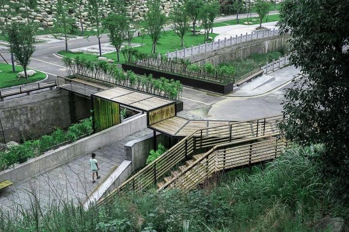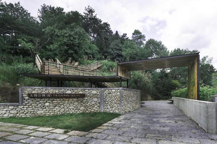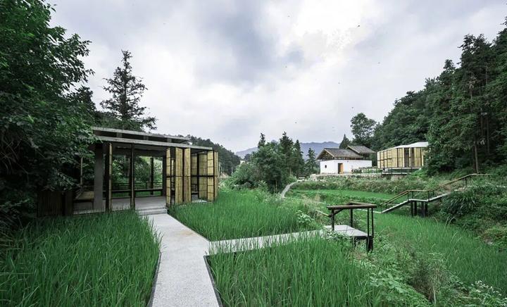 场地的水田、茶园、菜地都被全部保留并由它们原来的主人继续耕种,数条栈道被架设在水田之上,用最“轻”的方式使有人和这片水田交织在一起,栈道底层架空,水从栈道下方缓缓流过,禾苗垂与栈道之上,秋季收获之时栈道还为水稻收割和运输提供便利。
