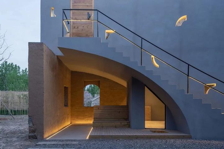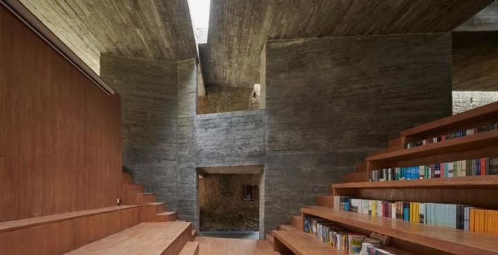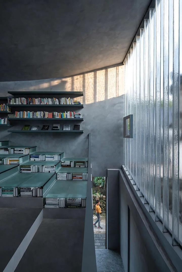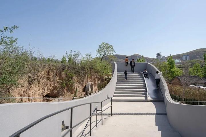 建筑的外形与内部空间顺应地形的状态而展开。屋顶以起伏的轮廓呼应着地形与远山,而起伏地面在屋顶自然形成室外阶梯平台与滑梯。跃升过老屋的曲线剖面沟通起首层入口、二层阳台与屋顶平台。室内为可以兼作小型论坛放映室的阶梯图书馆 。建筑蜿蜒的平面及周边路径,则成为周遭迷宫般窑洞系统的延伸。