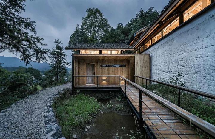 青龙坞是一片古村,隐匿在浙江桐庐的山林深处,因流经此地的一条溪水而得名。村中有一座木骨泥墙的老宅,紧邻一条山路,南面背靠青山,北面俯拥低台院落。Atelier tao+c 西涛设计工作室应业主之邀改造这座老宅,在占地仅232平米、高7.2米的双层空间中,置入一个可容纳20人的胶囊旅社、一个乡村社区书店和阅览室。