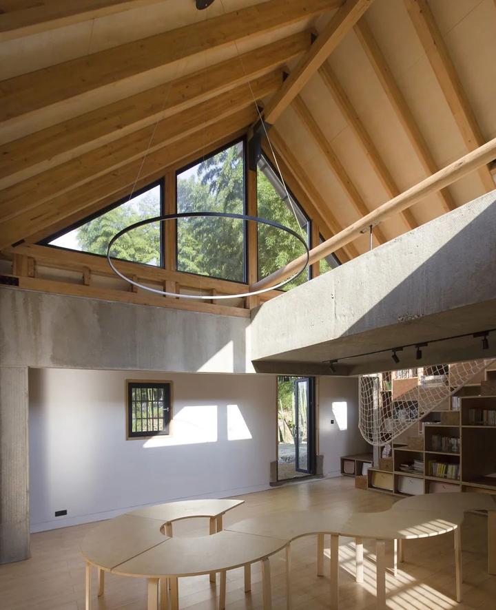 设计中,我们将建筑靠近景观的主楼西侧内部一二层打通,通过构造柱及圈梁等结构加固方式达到整体结构的稳定性,再将两棵“大树”植入其中,支撑新的屋顶的同时形成一个独特的阅读空间。