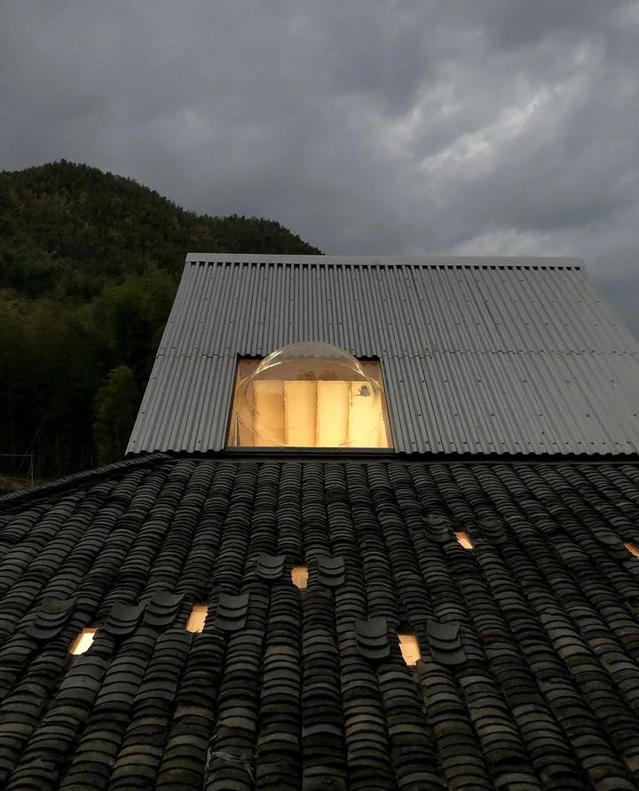 为解决原有房屋土坯外墙开窗受限和室内层高局促的问题,原顶部主屋面由东西坡向改为南北坡向,并将屋脊适当抬高,以此不仅可以利用旋转后形成的三角山面设置高窗,大幅改善室内自然采光环境,而且连通一半“桌面”,形成可领略自然、远眺天祝山的二层静怡空间。新屋面上设置的气泡窗不仅克服了楼梯上人高度的限制,而且为孩子们创造了一个风中竹林炫动的梦幻体验。