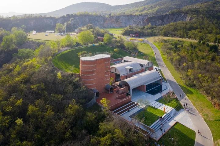 先锋汤山矿坑书店位于南京汤山矿坑公园内,原有砖窑呈现出一种“废墟”的美感,设计试图用“红砖+混凝土”的组合强化这种美学倾向。新建筑的墙身和场地的景观片墙采用红砖为主要的建筑材料来延续砖窑的质感,而拱则用混凝土浇筑而成,与矿坑公园山体上裸露的采石宕口相呼应。