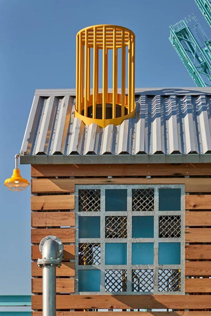 多米诺公园尽力保持工业遗址和一些遗址中的要素,设计师用黄色、绿松石色、绿色和金属光泽的颜色回应原来的工厂的调色板。重新使用的木料出现在高架舱的立面上,颜色鲜艳的气门轮毂分散在整个场地。一个高架的小屋、高耸的筒仓和一个工业容器以及不锈钢滑梯、爬架和狭窄的步行道,都让人联想起工厂原来复杂的建筑和基础设施。