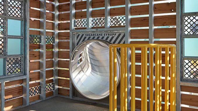11英亩工业用地上,具有历史的北部地标性的精炼糖厂建筑和五栋细长的工业遗址,整合了30多个大型、手工挑选的工厂机械。工业遗址包括21个原糖仓库的柱子,这是由艺术家Kara Walker精心设计的,大约585英尺长的工业遗址区中布置了很多座吊车,这些吊车是公园景观的一部分。四个36英尺高的圆柱形储罐用于在精炼过程中收集糖浆、系泊柱、斗式升降机和来自工厂的各种标号和仪表。