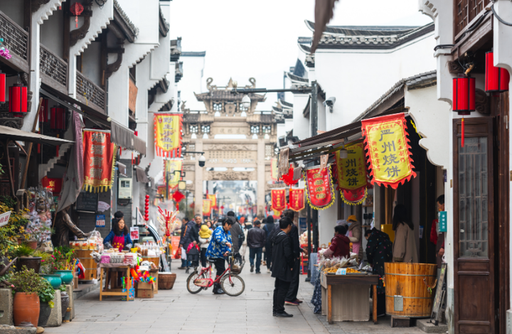 在商业方面,望仙谷打造了一个以民俗文化群像的商业街——岩铺街市。整个古街依托原有村落沿悠长的峡谷而建 ,严格按照赣东北民居传统建筑形制和构筑手法打造。古风、坡地、宗祠、戏台,整体营造出了一种明清古街的风格。