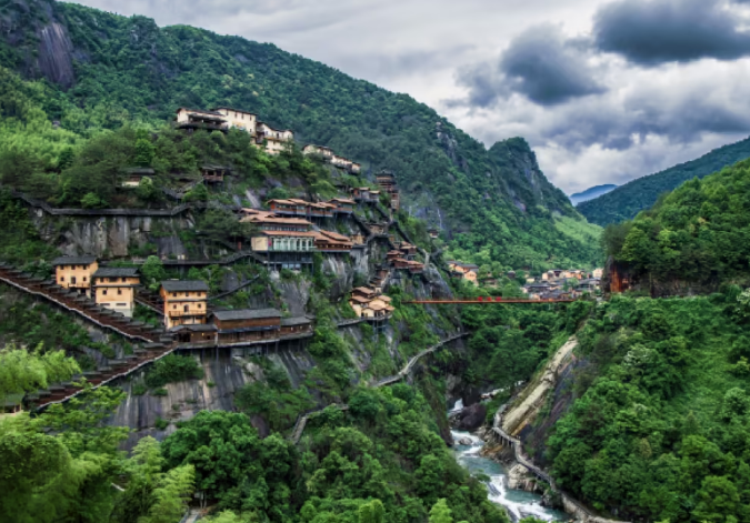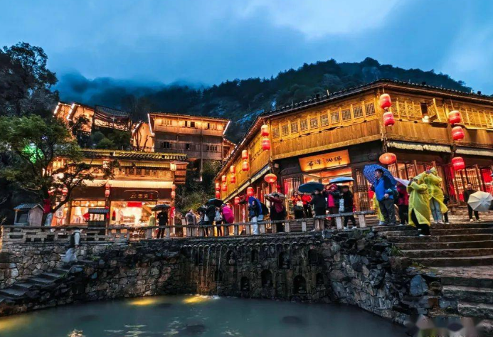 在建筑形态上,建筑基本上是依山形而建、沿峡谷成街,依山而建的建筑以栈道串联、小体量点缀的模式镶嵌在悬崖之上,完全融入了山川和峡谷的视觉流线中。此外,通过导入桥灯、自然门武术、串堂班等非遗文化区,创新活化方式,提高景区吸睛指数和文化内涵。并且,与名人典故深度融合,以当地历史名人胡昭、杨时乔为主题,新建望仙杨府、胡氏宗祠等仿古建筑,打造“名人游”“研学游”突破点。