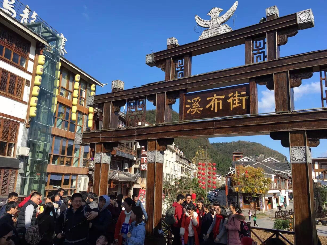 张家界溪布街位于张家界武陵源区景区核心,武陵源区政府对面,项目占地面积约100亩,总建筑面积约7万平方米,是全国唯一集水上酒吧街、中华名特小吃街、湘西民俗购物精品街、休闲客栈、创意工坊等为一体的大型的特色文化街区。