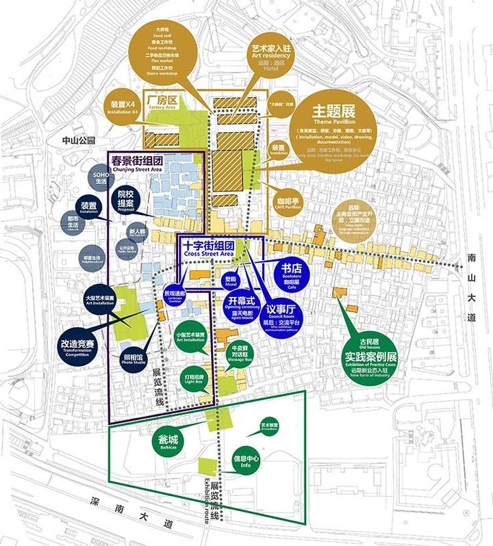 南头古城改造完成后分为四大功能区:历史怀旧区、艺术文化体验区、品质生活区、文化创意区,并依托空间举办多种形式的艺术文化活动,加强粤港澳三地的文化研讨交流与创新创意合作,打造湾区文化地标和设计、创意产业集聚地。
