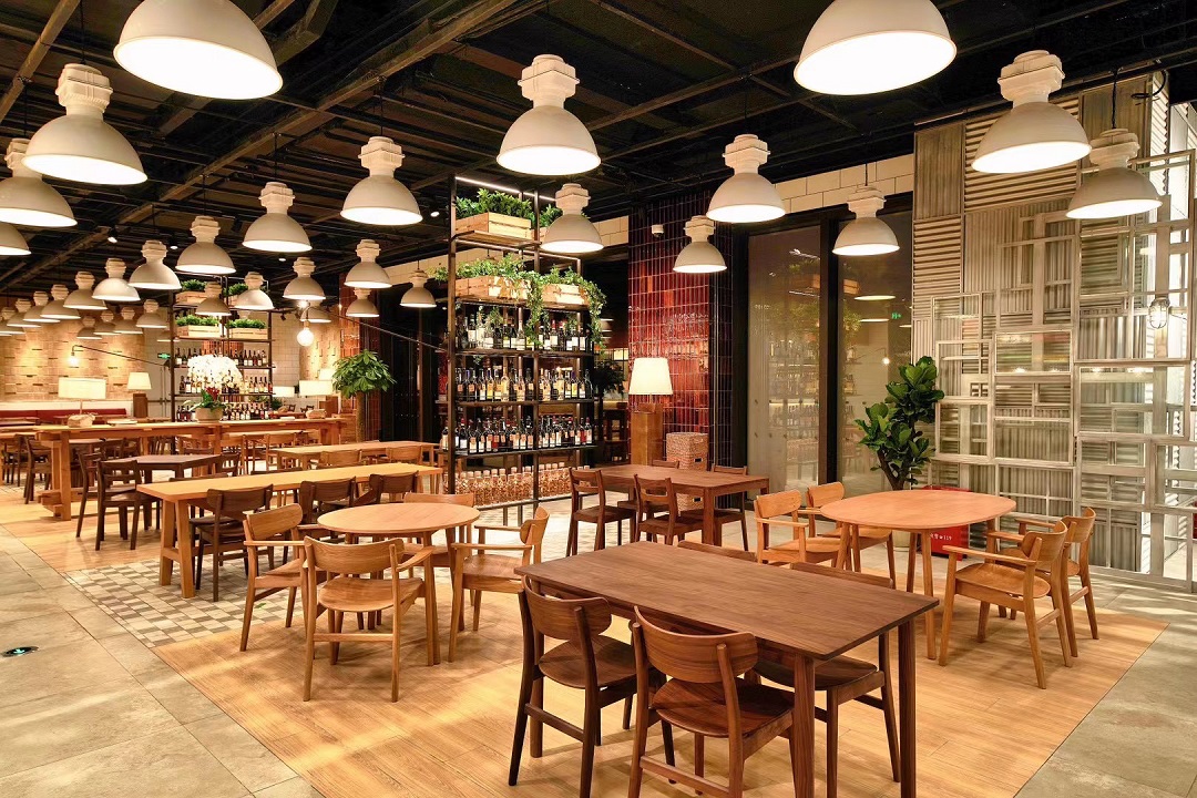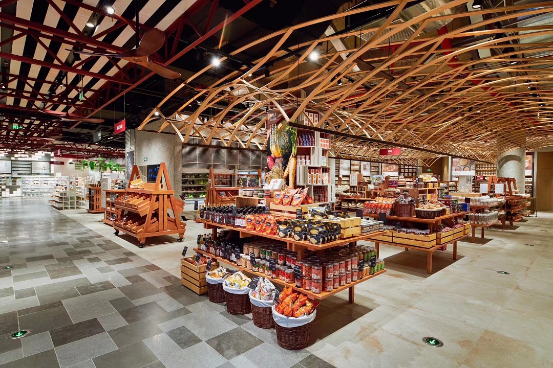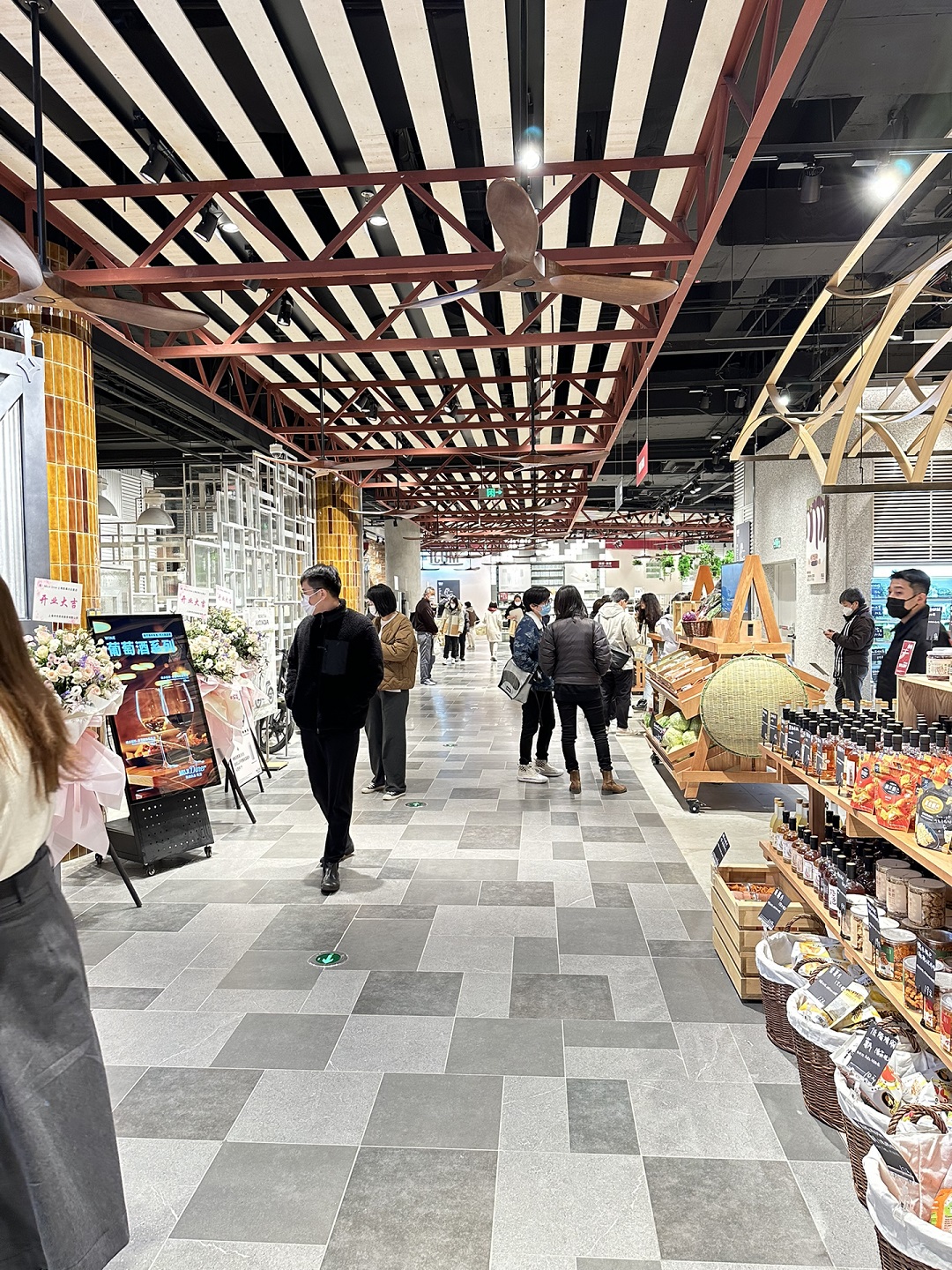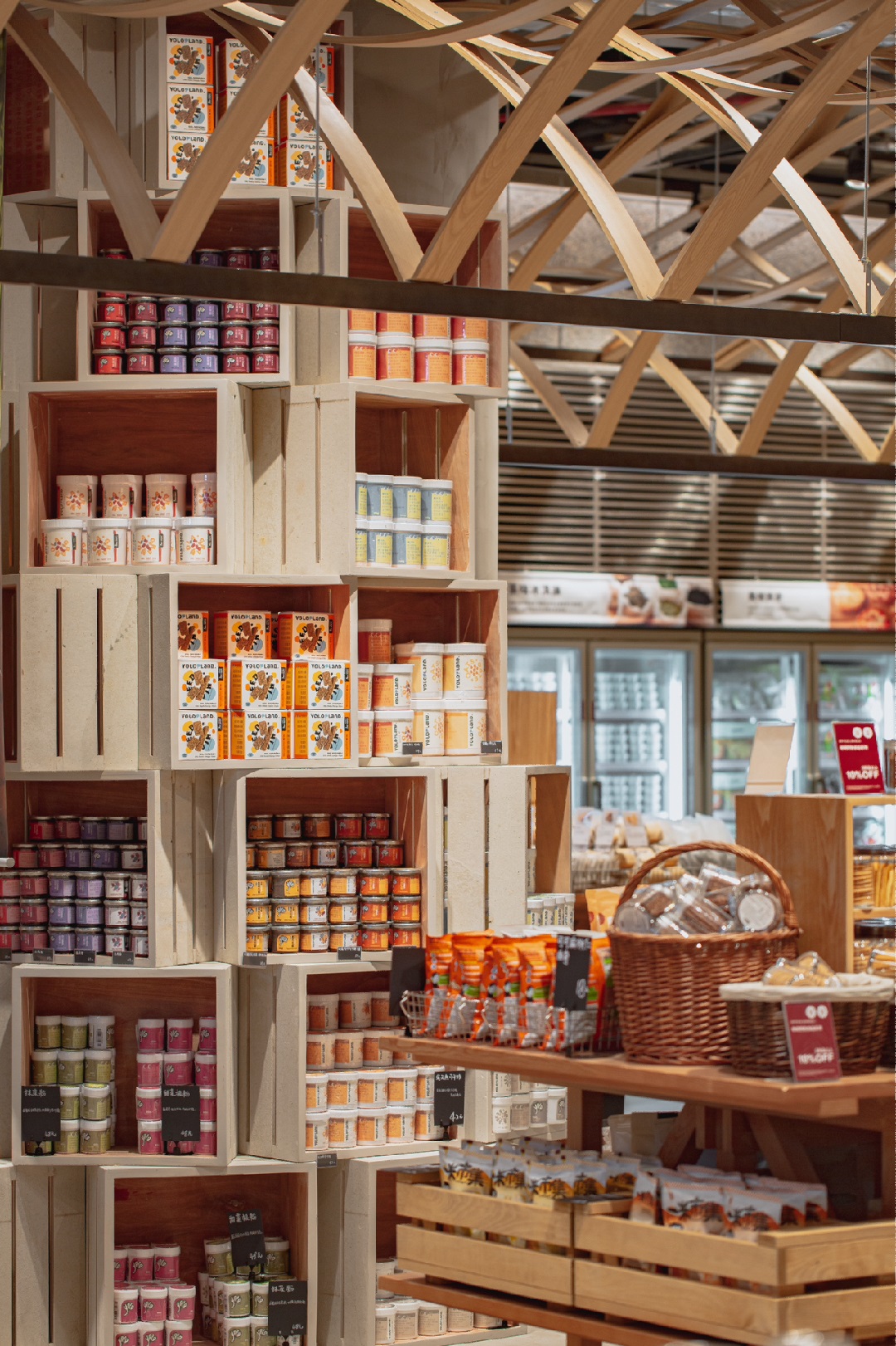 店面装修设计秉承一贯的MUJI风之外,还融入不少中国建筑元素,一改往日常规门店的陈列与布局,在日式简约风的基调里,加入本色系的瓷砖,粗粝的红砖块,黄麻纹面的砖墙作为搭配,满墙的食品罐头和酒瓶混搭,诠释出返璞归真的生活哲学。