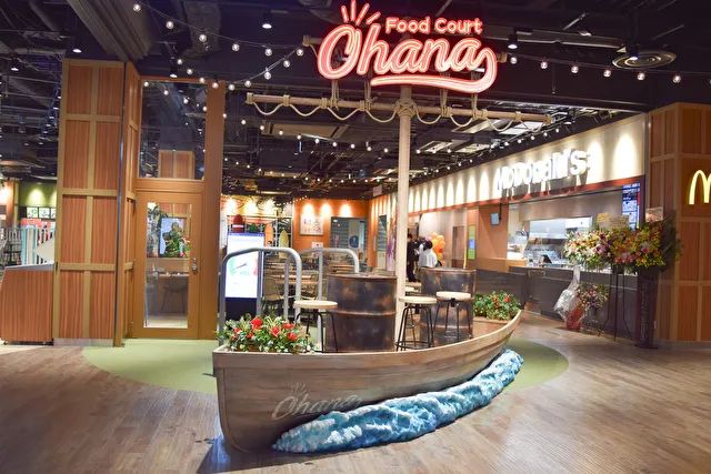 2楼“Food Court Ohana”,将夏威夷城市景观“搬进”美食广场,可以看到冲浪板、小船等装饰,与户外广场的美式海岛风格相呼应。