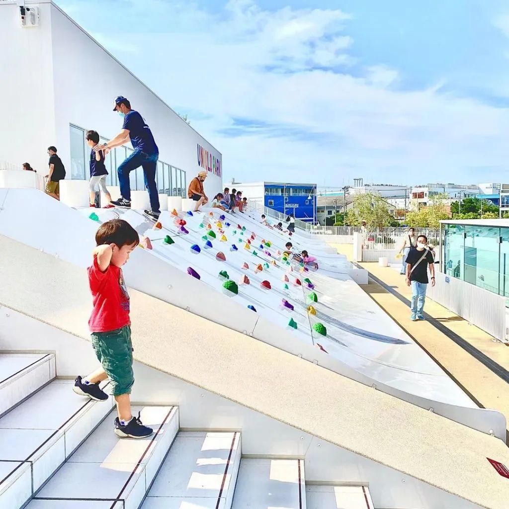 针对亲子家庭, UNIQLO PARK 在开阔的平地上建造了3层建筑,从1层地面到3层呈现一个特别的斜坡状形态,这些斜坡上设置了滑梯、攀岩等各式游乐设施,还划分了低龄儿童区和普通休息区,能够充分满足亲子互动、休憩等基本需求。