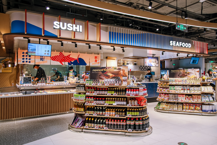 顾客可以自主选择来自全球美食,如地中海现制意面、沙拉,日式寿司、刺身、拉面,港式烧腊以及鲜榨甜菜头苹果汁等,还能现场选购鲜活海产、优质牛排等食材,在美食驿站的档口加工,满足一日三餐的即时性需求。周末与家人一起前来购物的李小姐表示,“这里不仅有很多没有见过的商品,逛累了还可以吃到手工鲜做的意面、入口即化的金枪鱼、健康减脂的自选沙拉和米其林餐厅首选食材5J现切火腿等等,这种超市加餐饮的一站式体验,给人一种逛街的感觉,非常的健康自由。”