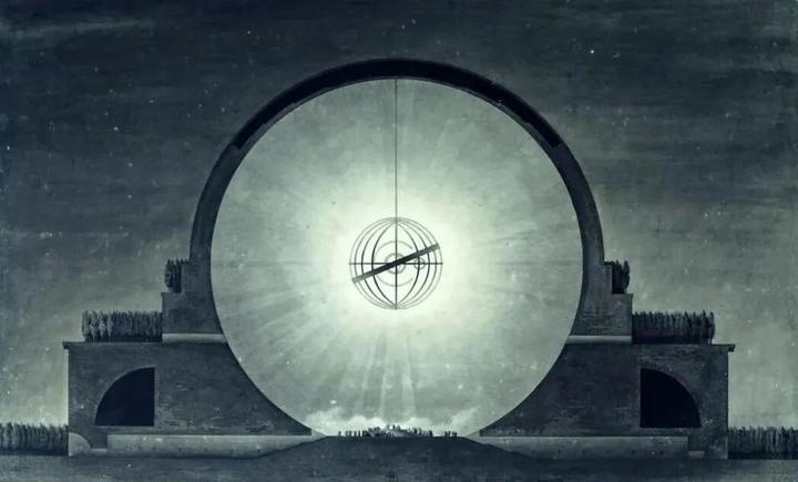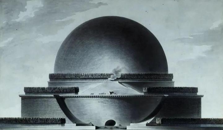 18世纪在世界史上是个特别迷人的时期,因为启蒙运动。史家对于启蒙运动的始与终并无定论,但传统上认为它肇始于1715年路易十四之死,终结于1789年法国大革命爆发。彼时有一连串熠熠闪光的名字:伏尔泰、狄德罗、卢梭、孟德斯鸠、大卫·休谟、亚当·斯密,还有康德,他们将18世纪整个欧洲的夜空照耀如白昼,法国新古典主义建筑师布雷(Etienne-Louis Boullée, 1728-1799)也是其中的一员。布雷推崇希腊和罗马理性严谨的建筑风格,他探索从自然中演变出来的纯粹的形式,进而回溯到希腊文化中那些不朽形式,然后将古典元素再次编排达到前所未有的规模性和戏剧性。牛顿纪念堂方案(未建成)是其代表作之一。