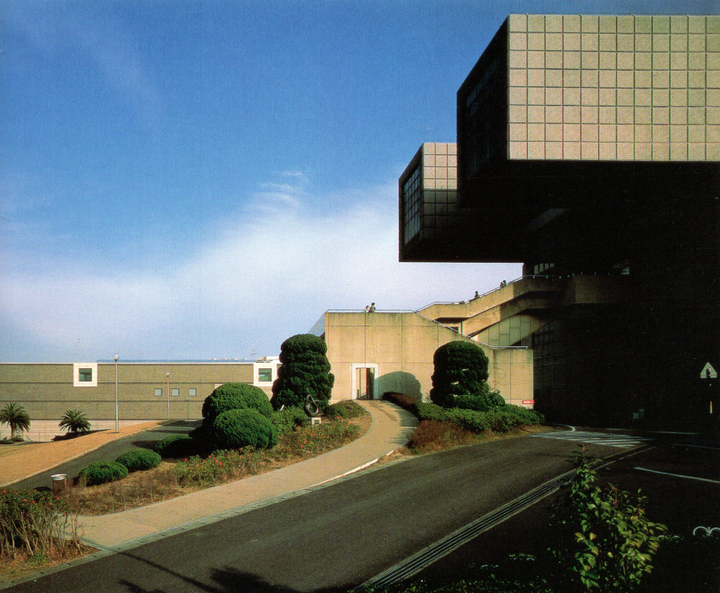 群马县立近代美术馆是矶崎新的第一个博物馆项目委托,并以他的“虚空艺术画廊”概念为基础。美术馆由一系列立方体组成,包括一个矩形的主干和突出的两翼。“立方体”概念延伸到大厅和画廊等室内空间,以及包括倒影池在内的外部区域。此后,博物馆经过扩建,增加了一个餐厅(1994年)和一个当代艺术厅(1997年),但所有续建工程都延续了最初的几何手法。