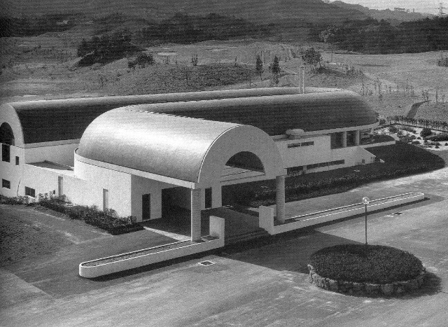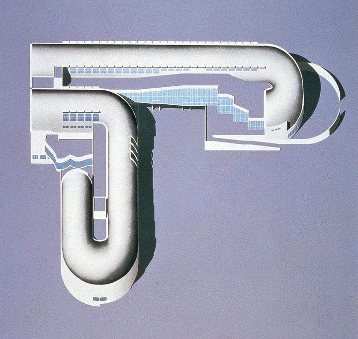 北九州市立中央图书馆,位于日本北九州市中心的胜山公园内,主要包括图书馆、历史博物馆和视听中心三部分。作为矶崎新的早期代表作,北九州市立中央图书馆表达了他后现代主义的设计倾向,建筑的一个重要特征是其拱形的屋顶。两根半圆形断面的管子扭转着弯曲及延伸,并成就了室内空间,无论是色彩还是形体,皆呈现出非常具有冲击力的视觉及心理震撼。