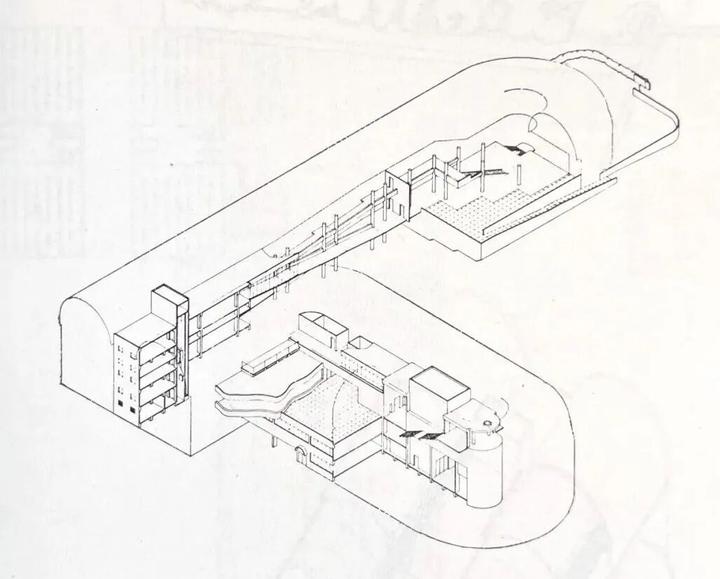 尽管矶崎新拒绝承认与「新陈代谢派」的原则有任何直接的关系,但不难看出,作为早期的北九州市立中央图书馆还是有几分「新陈代谢派」的感觉,它考虑了无限增建的可能性,将以半圆筒的形式不断地延伸下去。