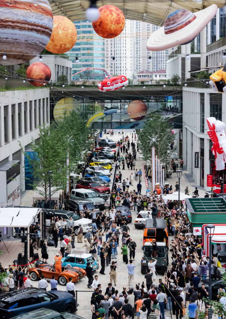天幕之下还有星球、飞碟等太空元素装饰,举办古董车展等大型活,形成科幻前沿、复古街巷、时髦潮流的强烈冲撞感。