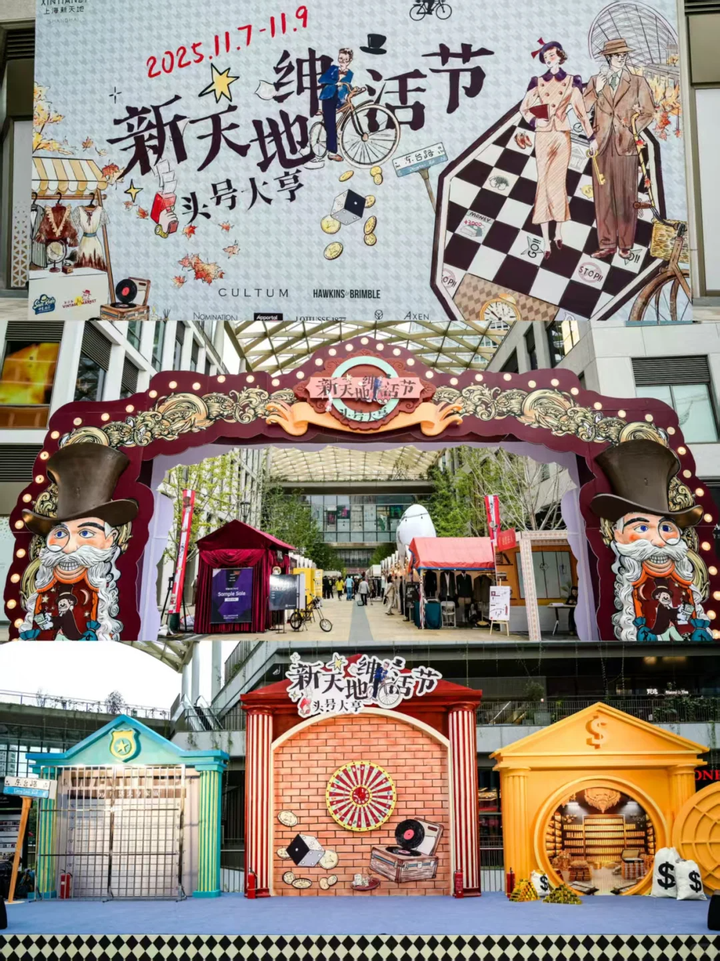 立意新锐的场景化、主题化营销络绎不绝。开业期间举办"新天地玩车节",50辆古董跑车巡展配合文创市集,天幕下形成打卡热点。近期举办绅活节摩登派对,设置沉浸式互动空间、15+绅装品牌、65+绅活市集摊位,7场绅活文化活动体验等;X PART街市,与30+品牌共创模拟未来街区的实验将抽象的未来商业构想转化、融入日常肌理。