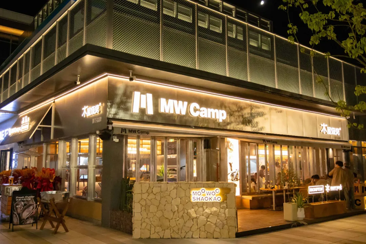 更有MW CAMP创新型多元复合商业空间,由木屋烧烤、折叠自行车品牌Brompton、户外品牌Snow Peak共同打造,在夜幕降临时营造出温暖治愈的深夜场景。