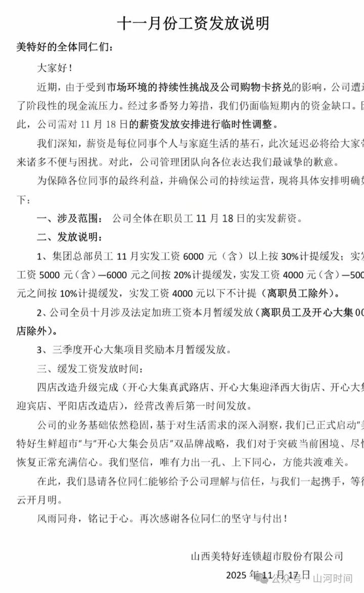 而在企业内部,有网络消息传美特好11月实发工资 6000 元以上按 30% 缓发,加班工资与项目奖励全部暂缓,数千名员工的生计承压。