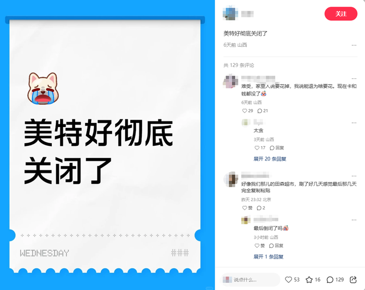 最为明显的表现就是:2025年9月,10月14日,美特好突然关闭14家老旧门店,既未提前预告,也未向消费者解释原因,瞬间引发市场恐慌:“是不是经营不下去了?”“储值卡里的钱会不会打水漂?” 持有储值卡的消费者开始集中涌入门店消费,挤兑现象初现。