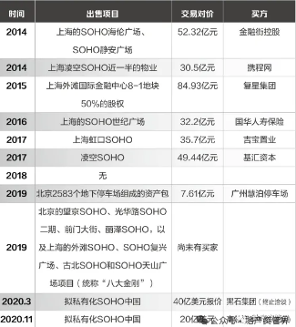 2016年,潘石屹又将上海SOHO世纪广场卖给国华人寿保险,总价32.2亿元。2017年虹口SOHO、凌空SOHO分别以35.7亿、49.44亿卖给了新加坡公司吉宝置业和香港知名私募基金公司基汇资本。