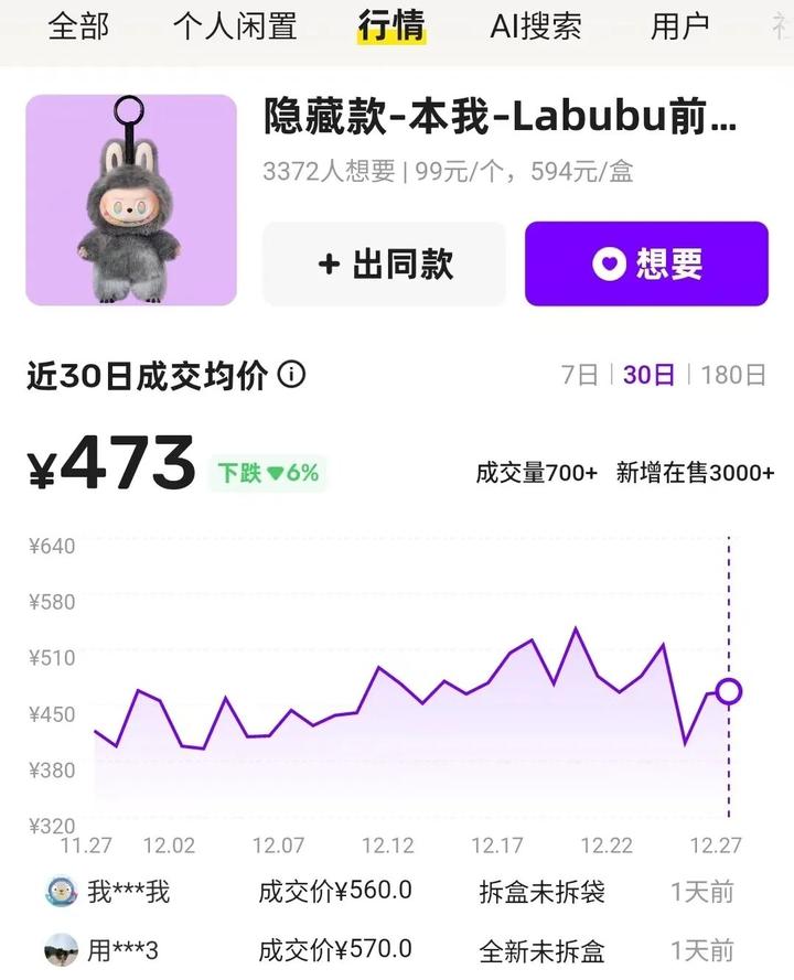 据公开数据,官方定价594 元的Labubu坐坐派对搪胶毛绒系列,二手平台价格从接近1500元回落至600元左右,单只99元的产品同样跌破了低价,完全没了往日的光彩。