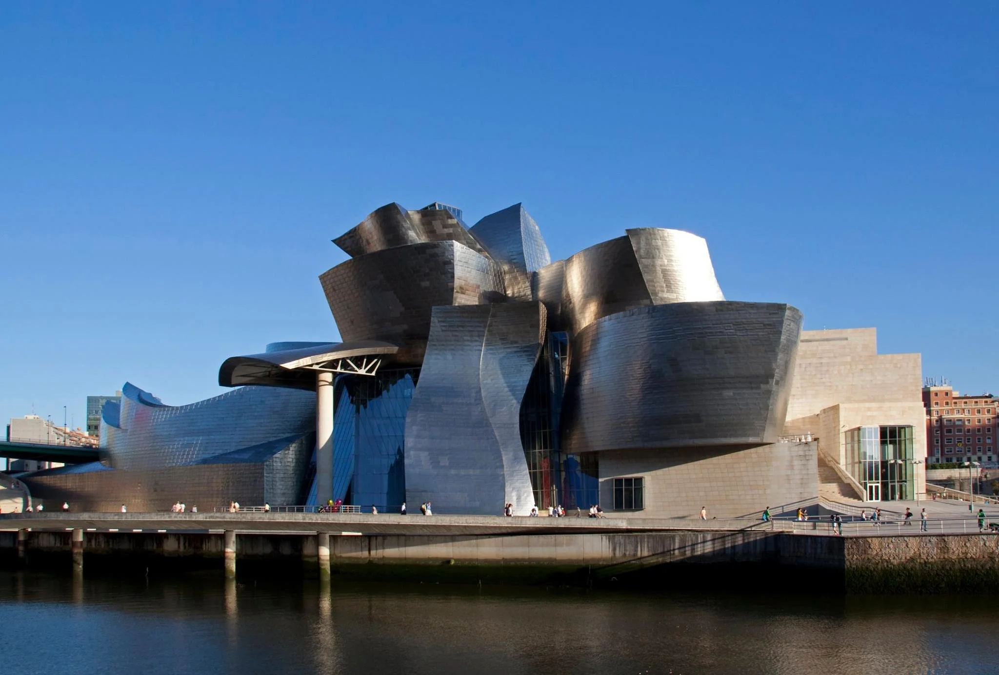 1997年落成的毕尔巴鄂古根海姆博物馆,这座令人惊叹的钛金属巨构,宛如一艘来自未来的星舰,像一朵在工业废墟上绽放的金属之花。